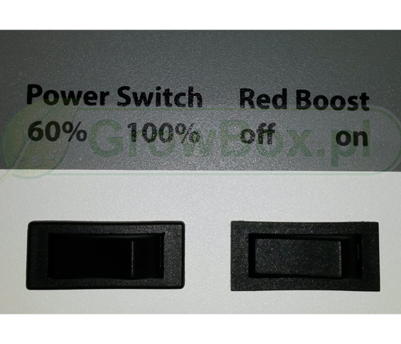 - Xplosion 800W posiada dodatkowe przełączniki, jeden regulujący światło białe w zakresie 60% i 100%, oraz drugi włączający suplementację światła czerwonego.