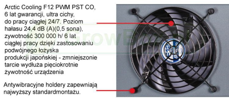 Arctic Cooling F12 PWM to ultra cichu układ chłodzenia z 6 Letnią gwarancją. Przystosowany do pracy ciągłej 24/7. Poziom hałasu 24,4 dB, żywotność 300 000 h co daje 6 lat ciągłej pracy dzięki zastosowaniu podwójnego łożyska. Antywibracyjne holdery zapewniają najwyższy standard montażu.